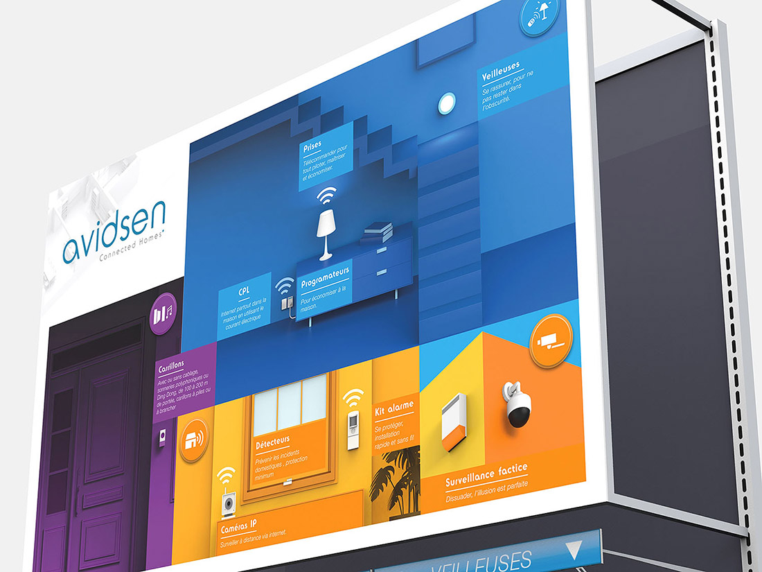 Series of panels and banners made for Avidsen with the theme of the connected home, security and home automation devices. The project was intended to be used in various countries and markets, covering a wide range of sizes and configurations.